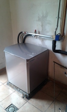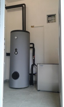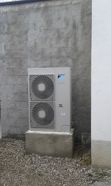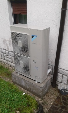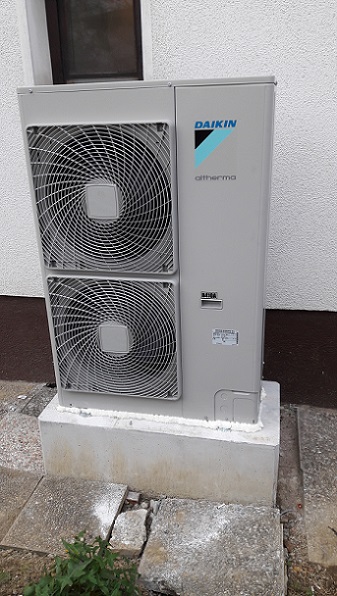 Visokotemperaturna toplotna črpalka. Pri nizkih temperaturah si ''pomaga'' s plinskim kotlom.